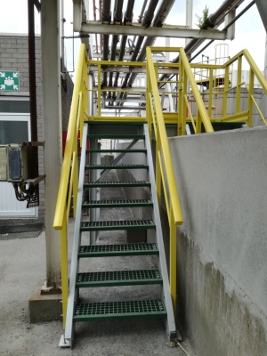 De Intermodule® GVK trappen van Fiberstruct worden vervaardigd uit isoftaal polyester (ISO-FR) profielen, traptreden en leuningwerk. Dit voldoet aan de EN-ISO 14122-3&4 normering.